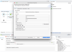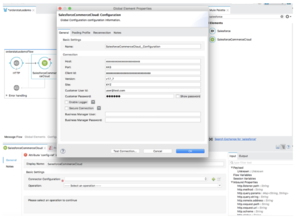 In the Mule Palette, select connectors and drag and drop Salesforce Commerce Cloud in to the flow designer, then create a new configuration and set your Credentials from your sandbox ,and select the operation Get Order and set the OrderNo as: