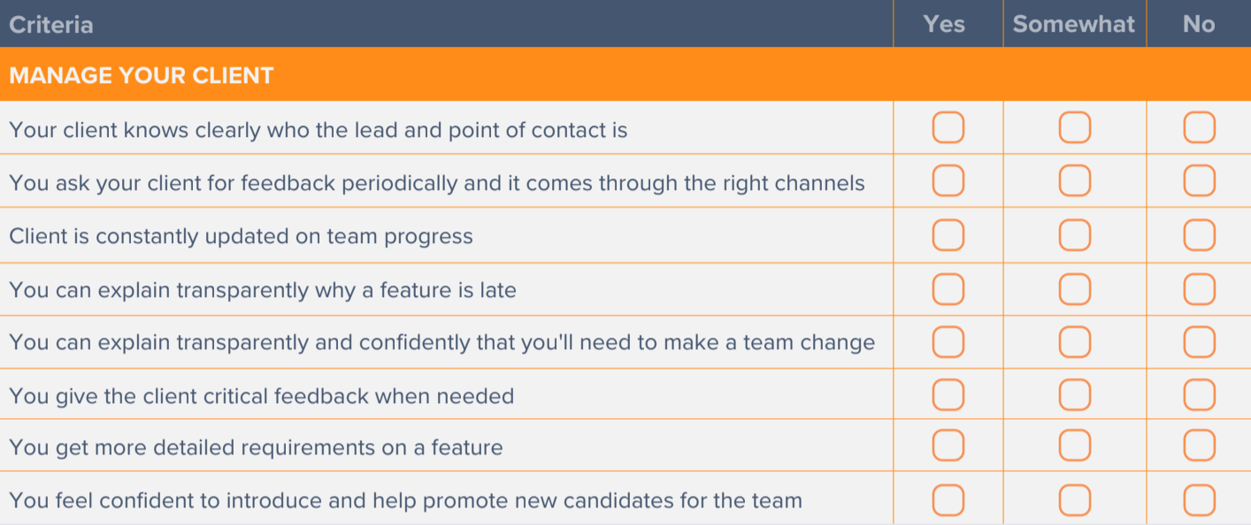 Now that you’ve created a structure for managing your own time and deliverables, we’ll dive into aspects of managing your client. We use the word “client” broadly here to refer to a boss, product manager/owner, or internal/external client.