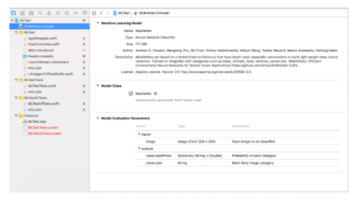After downloading the model, all you have to do is drag it to Xcode 9.0 anywhere under the project folder and it will recognize it. Make sure that the model is part of the main target so that Xcode also creates a swift class for it. Once loaded, you can see the characteristics of the model as well as the inputs and outputs it will take and produce.