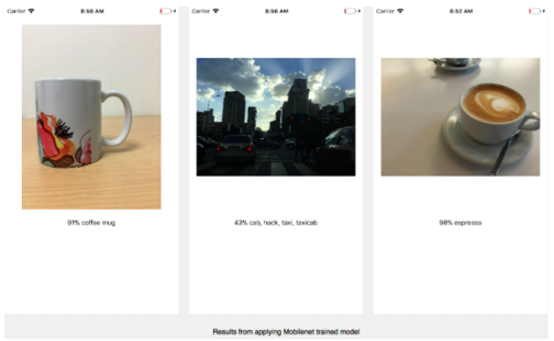 Once the model is ready, in order to get predictions all you have to do is instantiate it and set the input data. MobileNet takes images as input and it will produce two different outputs: one that is called 'classLabel,' a String that contains which one is the most likely image category, and the second 'classLabelProbs,' a dictionary containing all the possible categories along with the probability for each one.